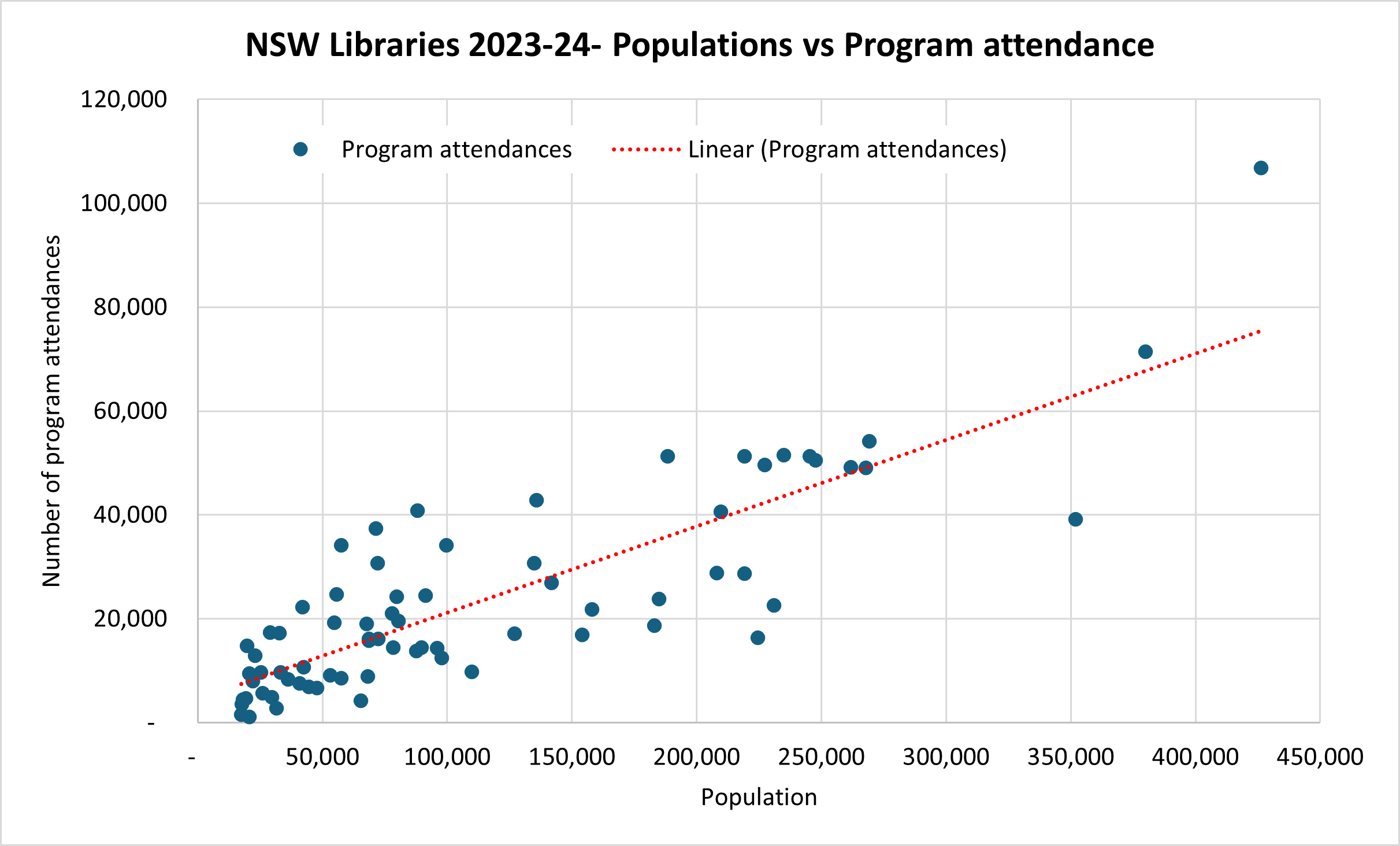 Another rising trendline and another very strong correlation of 0.84. Even dropping the three big LGAs (that is, Blacktown, Canterbury-Bankstown and Central Coast) only drops the correlation to 0.79. The larger the residential population the more people will attend library programs – and we haven’t even considered what number or type of programs these NSW libraries are offering.