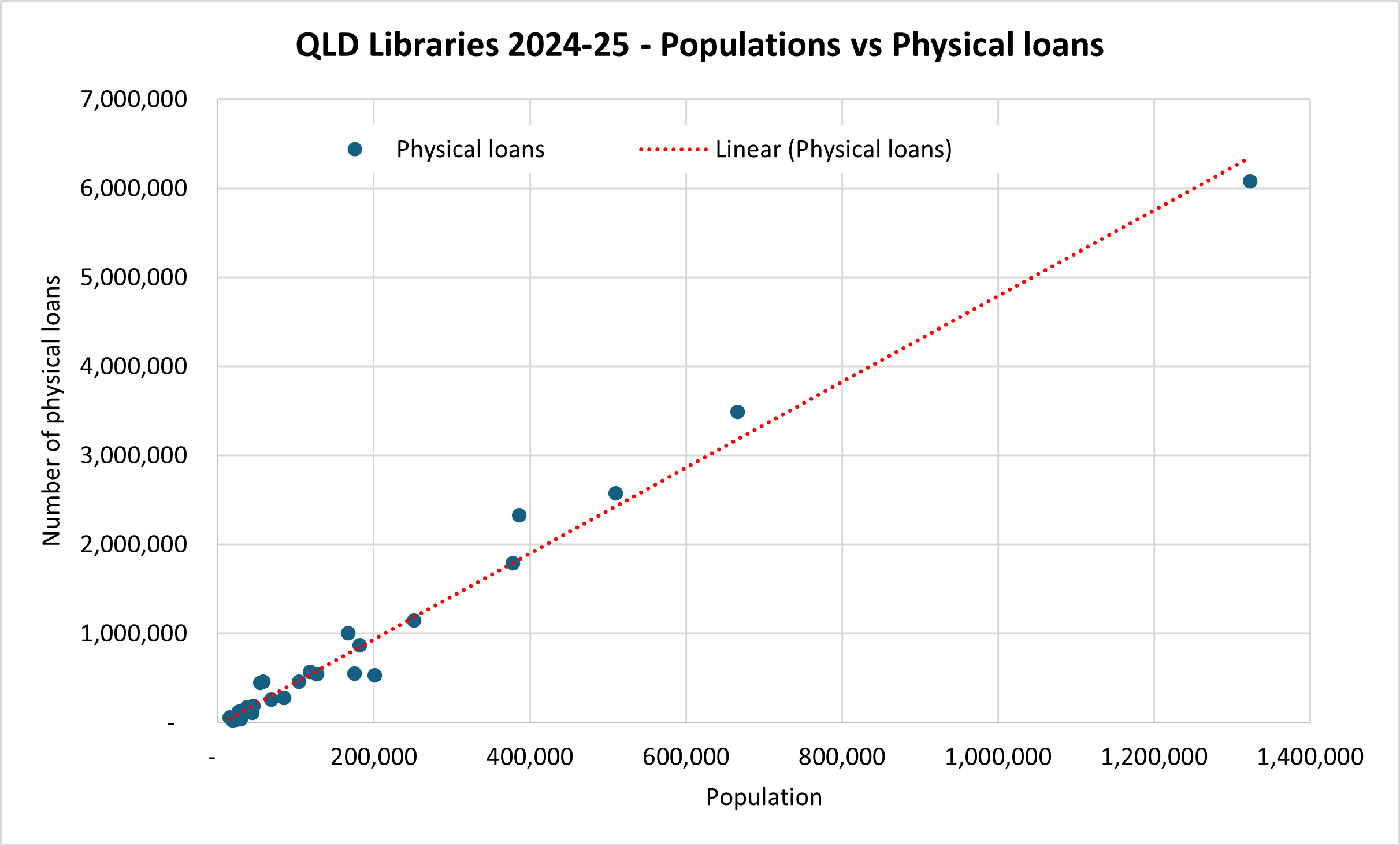 Let’s, for example, take visits to Victorian libraries in 2024-25. It’s pretty clear that the libraries with the largest populations (that is, Yarra Plenty, Your Library, Connected Libraries, Geelong Regional) have the highest number of total visits. No, it’s not a perfect correlation but on a scale from 1.0 (perfect positive) to -1.0 (perfect negative) a correlation of 0.90 is enough for me to say with extreme confidence that larger populations result in more library visits. And that this is true regardless of location (inner metro, outer metro, regional, rural) and of demographic profile (age, socio-economic status).