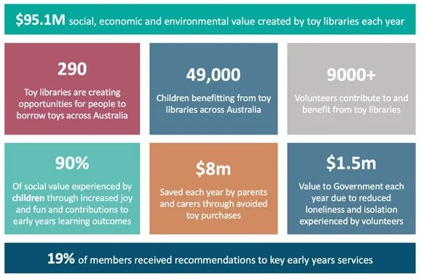 Second, I came across Think Impact’s Valuing play: The social impact of toy libraries in Australia (a social return on investment analysis), a research report funded by the Department of Social Services and the Department of Health, Disability and Ageing. The report documents the value of toy libraries in terms of benefits for parents and children, for the early years system, for volunteers and for Government.